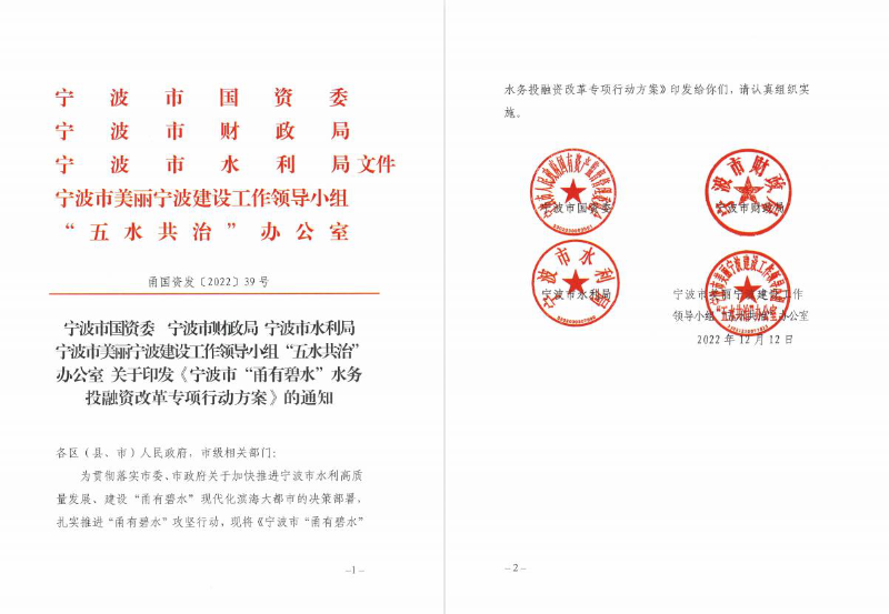 為加快推進寧波市水利高質量發(fā)展、建設“甬有碧水”現(xiàn)代化濱海大都市,市國資委、市水利局、市財政局、市“五水共治”辦等四部門聯(lián)合出臺《寧波市“甬有碧水”水務投融資改革專項行動方案》(以下稱《行動方案》)。