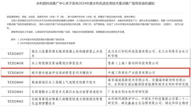 近日,中建三局綠投公司科研成果“城市主干排水暗涵評估清淤修復關(guān)鍵技術(shù)研究應用”成功入選《2024年水利部先進技術(shù)重點推廣指導目錄》。該目錄旨在圍繞國家重大戰(zhàn)略實施,和水利高質(zhì)量發(fā)展需求,遴選先進、成熟、實用的技術(shù),面向社會公布,推動行業(yè)技術(shù)水平升級提高。