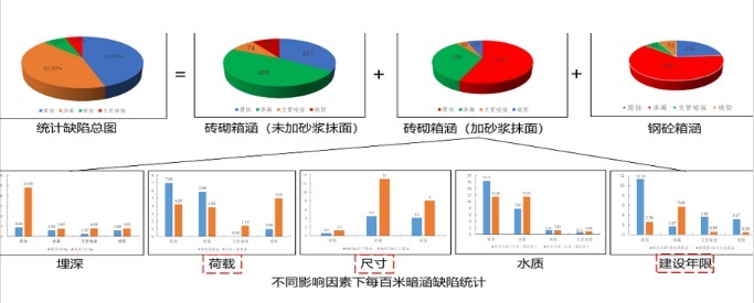初評估技術(shù)在預評估基礎(chǔ)上,采用全地形檢測機器人,檢測目標區(qū)域水面以上缺陷,利用水面以上顯性缺陷,推求水面以下隱形缺陷,整體精度高達80%以上,加快鎖定病害集中區(qū)域,終評估在傳統(tǒng)CCTV表觀檢測基礎(chǔ)上,引入結(jié)構(gòu)分析因子,完成暗涵整體結(jié)構(gòu)性檢測,更準確評估暗涵缺陷狀況,實現(xiàn)暗涵病害嚴重程度評級,有助于資源優(yōu)化配置,提升整體效率。